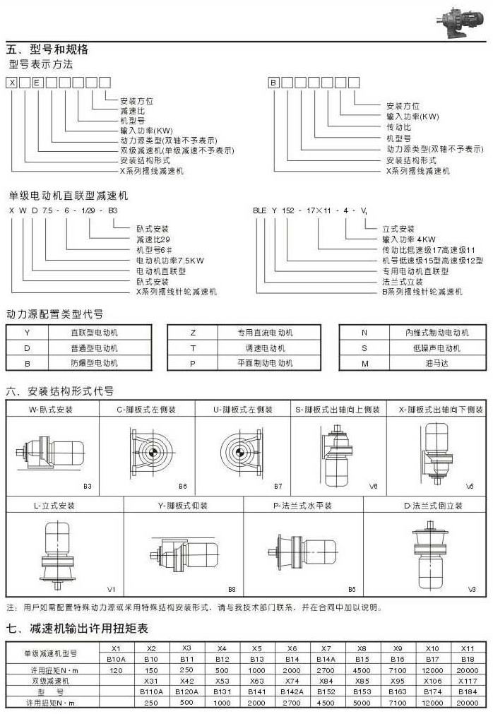 機型號和規(guī)格表示法安裝結(jié)構(gòu)形式代號減速機輸出許用扭矩表